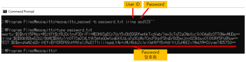 Password.txt의 Password값은 mosquitto_passwd 명령을 이용하여 암호화된 값이 저장된다.