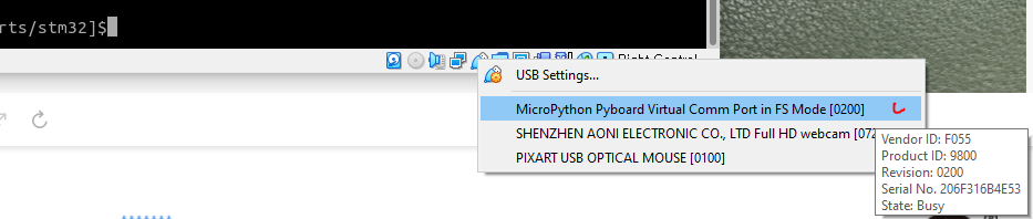 USB setting을 누르면 MicroPython Pyboard Virutal Comm Port in FS Mode 로 표시되는데, 클릭해줍니다.