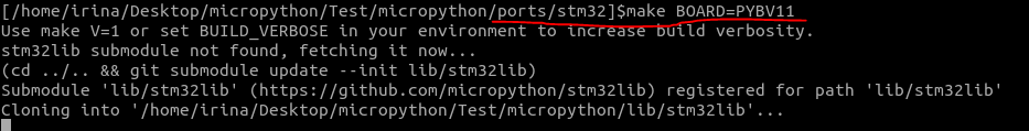 전 Pyborad v1.1을 사용하기 때문에, BOARD=PYBV11 로 입력합니다.