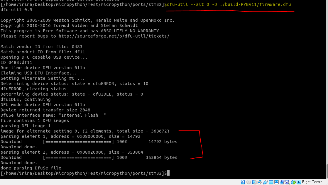 dfu-util --alt 0 -D ./build-PYBV11/firmware.dfu